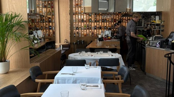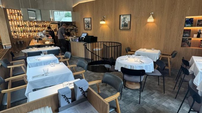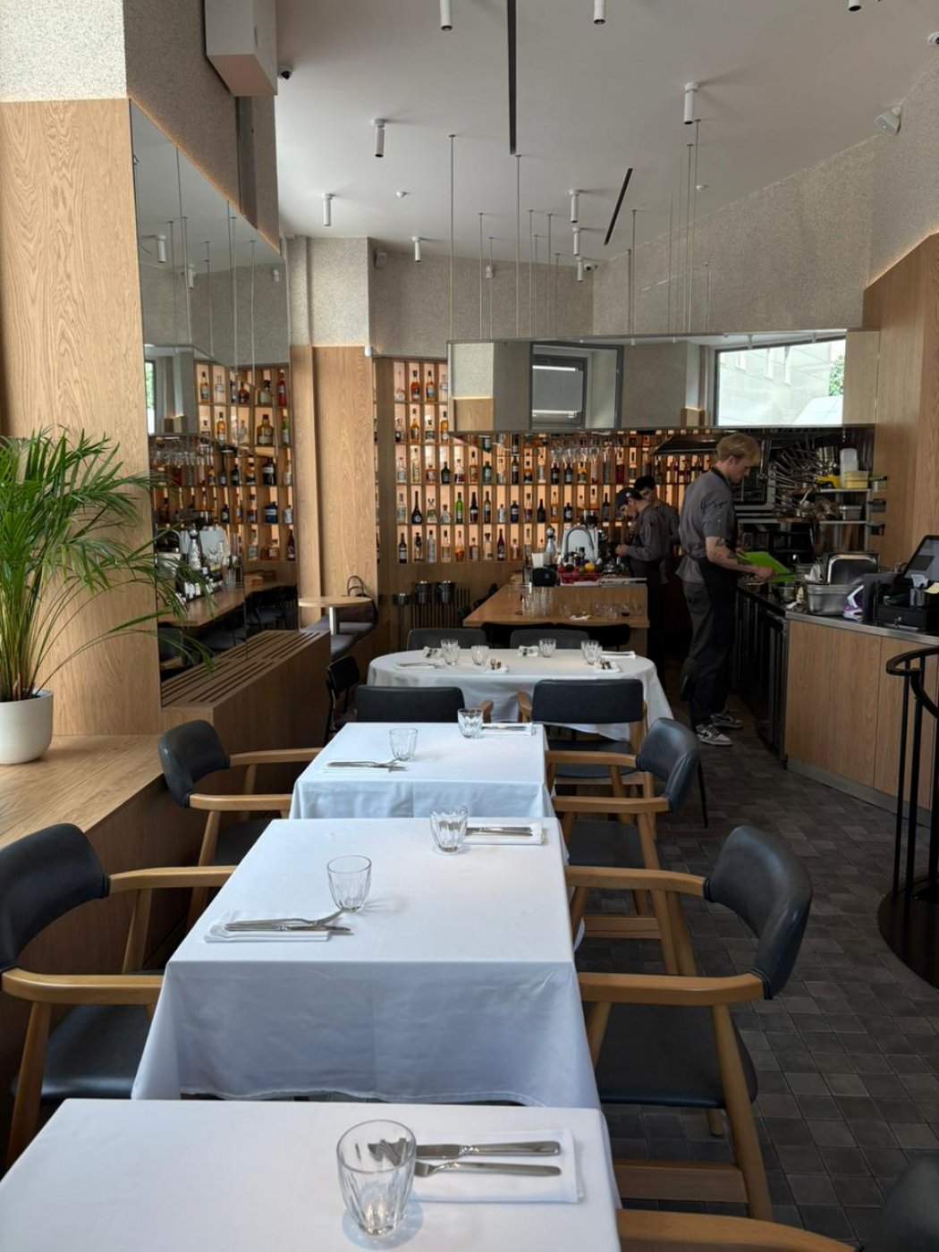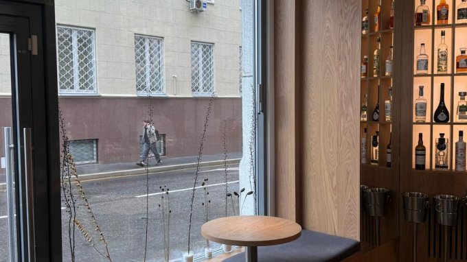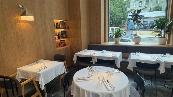 Бистро занимает небольшое уютное пространство с открытой кухней и панорамными окнами. Строгий и лаконичный интерьер от архитектора Михаила Князева наполнен винтажной атмосферой парижского бистро. Внутри – черная винтовая лестница, много дерева и серые шероховатые стены. На стенах развесили фотографии в стиле ретро и графичные панно, подсветили неоном барные стеллажи, расставили на подоконниках зелень, а на полках книги и игрушки. Гостям предлагают расположиться за столиками из светлого дерева на черных кожаных стульях.